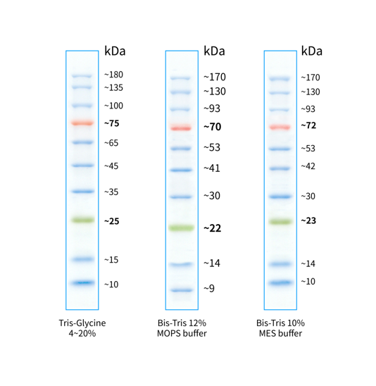 本產(chǎn)品由跨度從 10-180 kDa 的 10 種高度純化預(yù)染的重組蛋白質(zhì)組成,各條帶濃度約為 0.2-0.4 mg/ml。其中 25 kDa 條帶為綠色預(yù)染條帶,75 kDa 條帶為紅色預(yù)染條帶,方便判斷各個條帶的準確位置。本產(chǎn)品適合作為 SDS-PAGE 電泳時,變性蛋白樣品的分子量參照,并可實時觀察蛋白樣品的電泳分離狀況,也可用于檢測 Western blot 的轉(zhuǎn)膜效率。由于共價結(jié)合的染料會影響蛋白質(zhì)分子的電泳遷移率,本產(chǎn)品僅適于粗略地估計目的蛋白樣品的分子量。