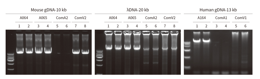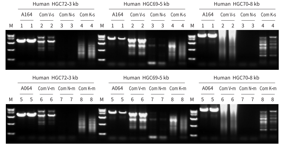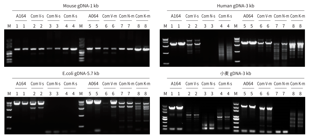 分別以人、小鼠、小麥、E.coli gDNA 為模板,使用 A064/A164、Com V、Com N、Com K 進(jìn)行不同長(zhǎng)度片段擴(kuò)增。結(jié)果顯示,A064/A164 對(duì)不同種屬來(lái)源不同長(zhǎng)度的 gDNA 片段兼容性強(qiáng),均能良好擴(kuò)增,且優(yōu)于 Com V、Com N 和 Com K