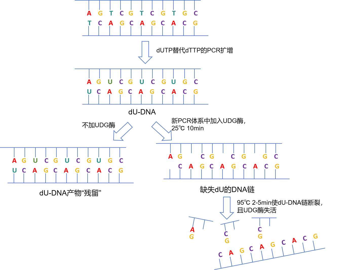 利用UDG酶選擇性水解含dU的DNA單鏈或DNA雙鏈的機(jī)制,巧妙地引入dUTP取代PCR體系中的dTTP而構(gòu)成了dUTP/UDG酶防污染系統(tǒng)。