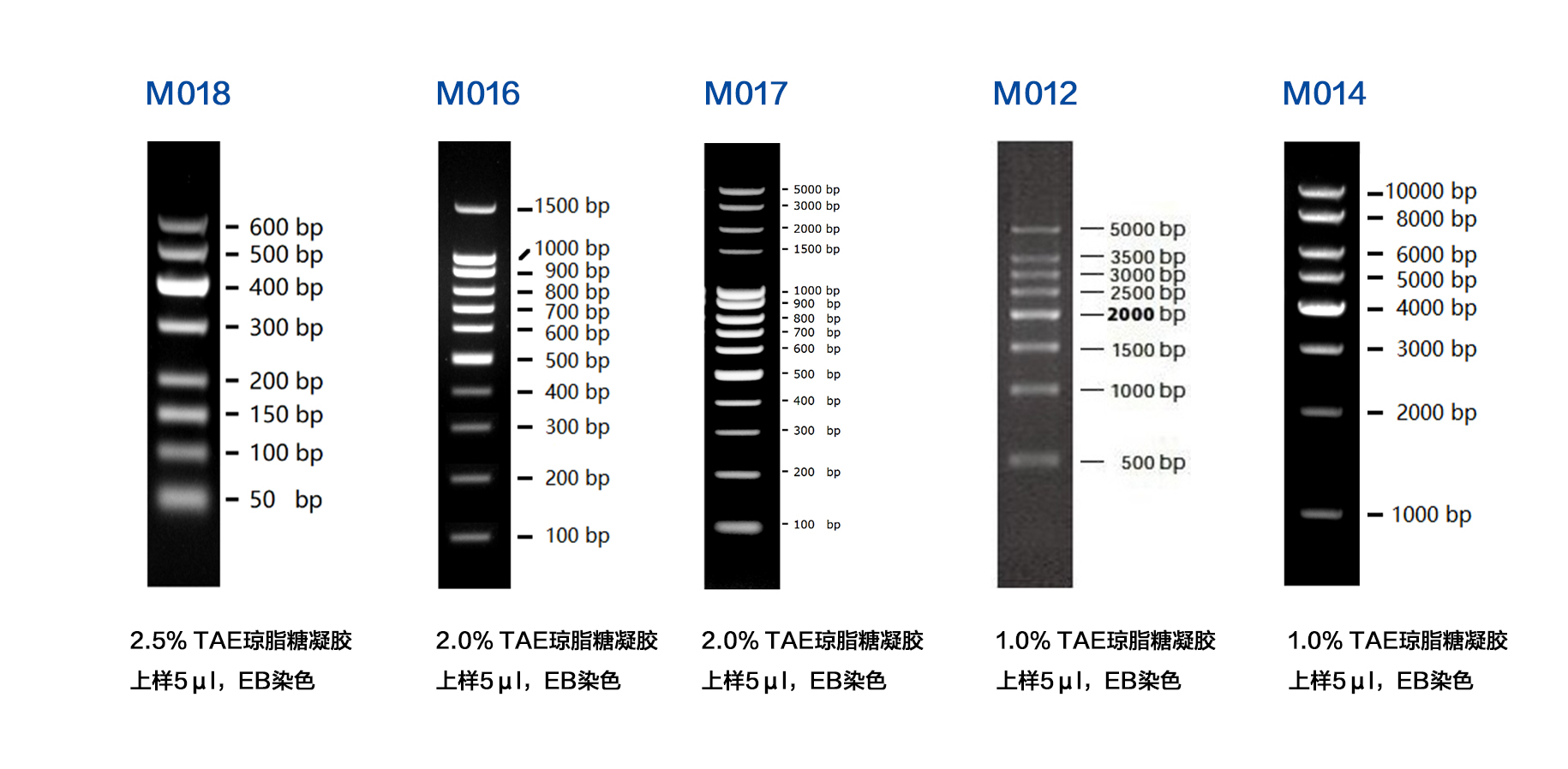 本產(chǎn)品為預(yù)混有 1x 上樣緩沖液的即用型 DNA 分子量標準,由 14 條線狀雙鏈 DNA 條帶組成,適用于對 100-5000 bp 的雙鏈 DNA 分子大小的估算和粗略定量。本產(chǎn)品的 14 條帶分別為 100、200、300、400、500、600、700、800、900、1000、1500、2000、3000 和 5000 bp。上樣 5 ul 時各條帶的 DNA 含量分別為 50 ng、40 ng、30 ng、40 ng、100 ng、60 ng、70 ng、80 ng、90 ng、100 ng、50 ng、50 ng、50 ng、50 ng。