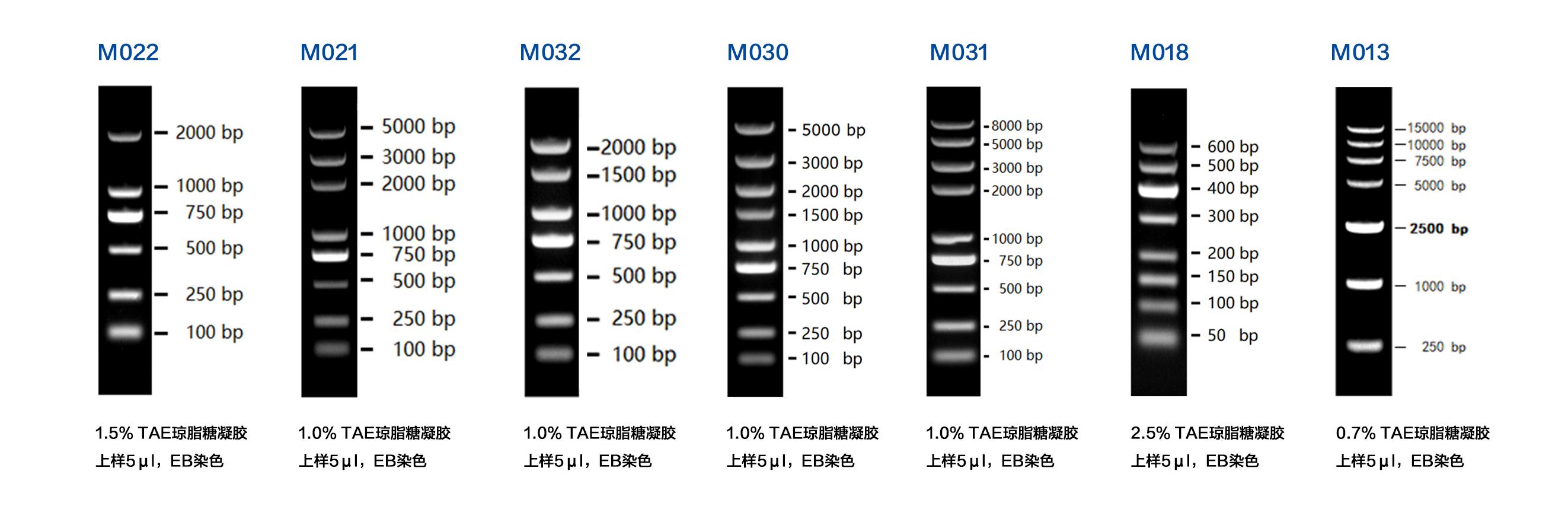 本產(chǎn)品為預(yù)混有 1× 上樣緩沖液的即用型 DNA 分子量標(biāo)準(zhǔn),由 9 條線狀雙鏈 DNA 條帶組成,適用于對 100-8000 bp 的雙鏈 DNA 分子大小的估算和粗略定量。本產(chǎn)品的 9 條帶分別為 100、250、500、750、1000、2000、3000 和 5000 bp、8000 bp。其中 750 bp 條帶濃度最大,為 100 ng/5 µl,其余條帶濃度約為 50 ng/5 µl。