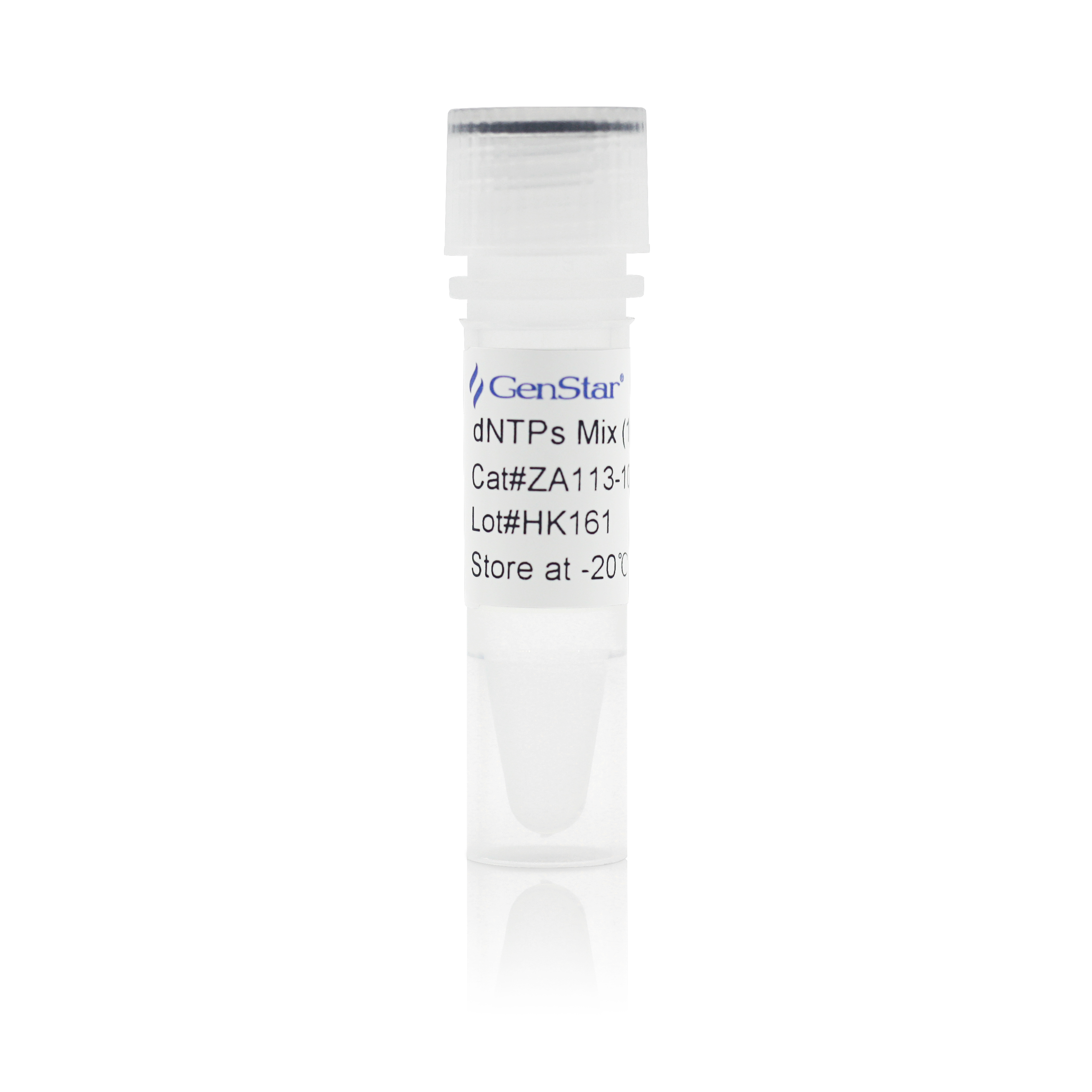 本品由等摩爾數(shù)的 dATP、dTTP、dGTP 和 dCTP 混合而成,適用于作為 PCR 反應(yīng)和反轉(zhuǎn)錄反應(yīng)的底物,或其它 DNA 聚合酶的底物。每種 dNTP 的終濃度為 10 mM,純度 ≥98%。經(jīng)檢測無 DNA 酶、RNA 酶和磷酸酶污染。