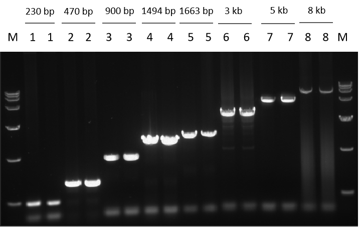 以抗凝劑為 EDTA 的人抗凝血為模板,使用 A161 對不同長度 DNA 片段進行 PCR 擴增。電泳檢測結(jié)果顯示,A161 對不同大小的片段擴增能力均較強,可以高效擴增長達 8 kb 的片段。