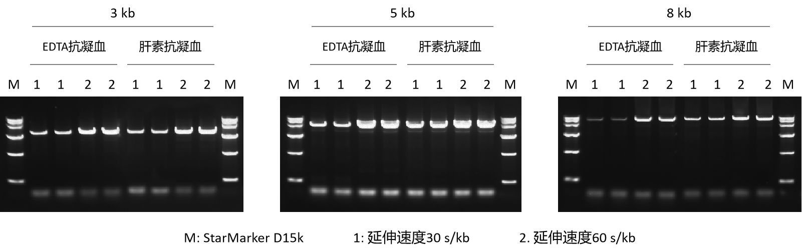 以濃度為 10% 的人全血為模板,使用 A161 進行 PCR 擴增,延伸時間分別設置為 30 s/kb 和 60 s/kb,電泳結(jié)果顯示,延伸時間為 30 s/kb 即可擴增出不同長度的目的條帶,延伸時間越長,擴增產(chǎn)物量越大,當擴增片段長度 ≥5 kb,建議延伸時間設置為 60 s/kb。