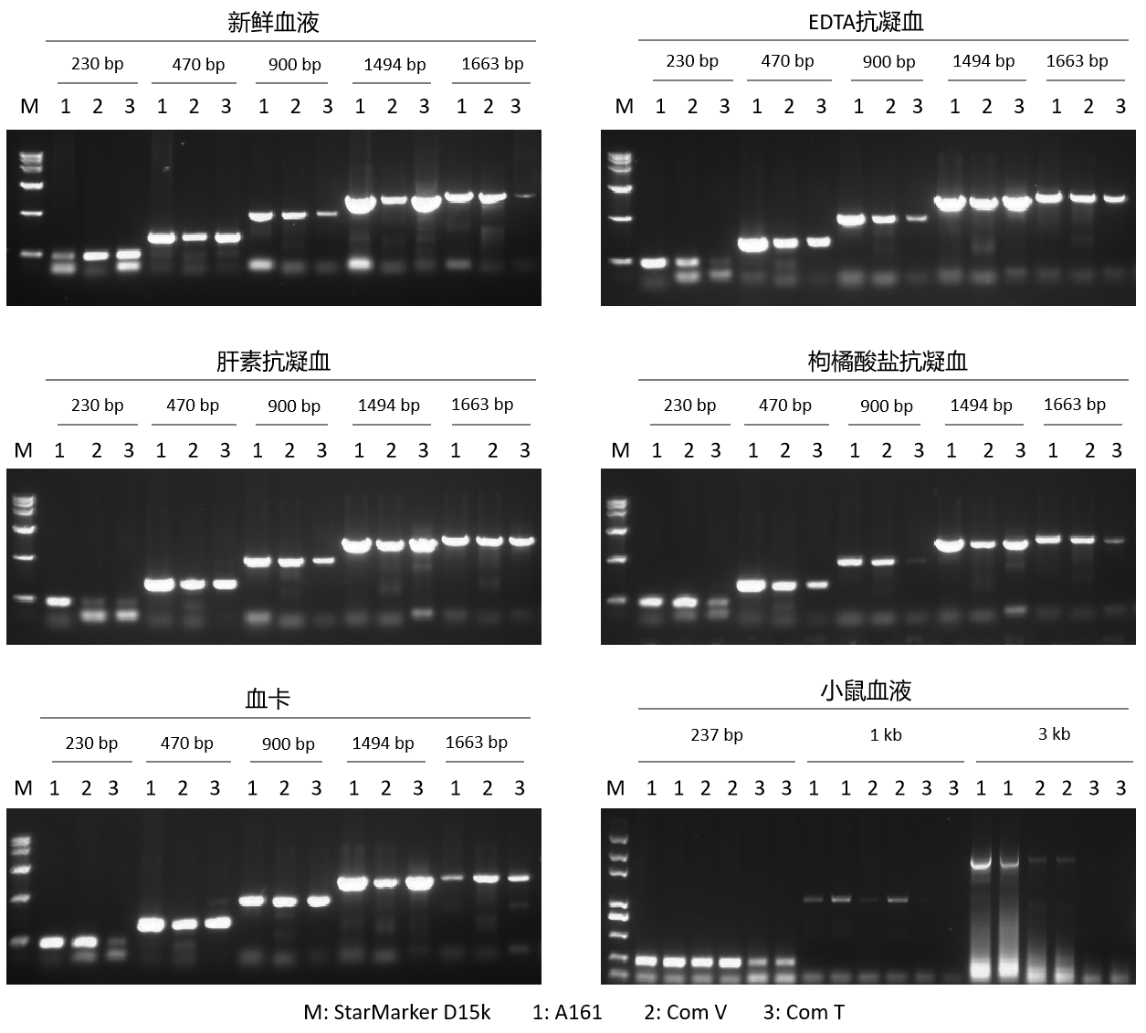 以人的新鮮血液、常規(guī)的抗凝血(EDTA、肝素、枸橘酸鹽)、血卡、小鼠新鮮血液為模板,分別使用 A161、Com V 和 Com T 進行 PCR 擴增。結(jié)果顯示,A161 具有超強的抑制劑耐受性,可對不同類型血液樣本進行 PCR 擴增,且擴增性能優(yōu)于 Com V 和 Com T。