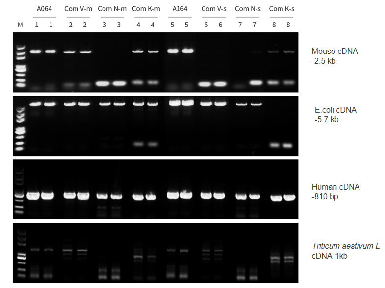 分別以人、小鼠、E.coli cDNA 為模板,使用 A064/A164、Com V、Com N、Com K 進(jìn)行不同長度片段擴增。結(jié)果顯示,A064/A164 對不同種屬來源不同長度的 cDNA 片段兼容性強,均能良好擴增