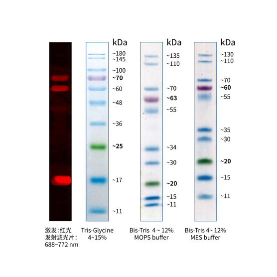 本產(chǎn)品由跨度從 11-180 kDa 的 10 種高度純化預(yù)染的重組蛋白質(zhì)組成。10 種條帶分別為:11、17、25、36、48、60、70、100、145、180 kDa。其中 25 kDa 條帶為綠色預(yù)染條帶,70 kDa 條帶為紫色預(yù)染條帶,17、60、70 kDa 三個(gè)條帶可用于紅色波長(635 nm 激光或紅色 LED )的熒光印跡檢測(cè),方便判斷各個(gè)條帶準(zhǔn)確位置。