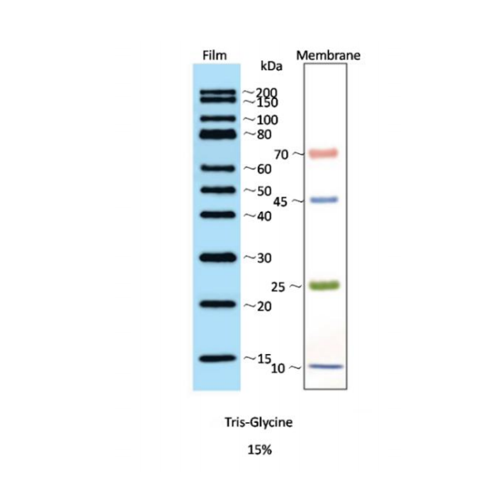 本產(chǎn)品由跨度從 10-200 kDa 的 14 種純化的天然蛋白混合而成。其中 25 kDa 條帶為綠色預(yù)染條帶、10 kDa 和 45 kDa 條帶為藍(lán)色預(yù)染條帶、70 kDa 條帶為粉色預(yù)染條帶,便于動(dòng)態(tài)觀察電泳狀態(tài),方便判斷各個(gè)條帶的準(zhǔn)確位置和轉(zhuǎn)膜效果。其他 10 條條帶含有多種 IgG 亞型結(jié)合位點(diǎn),可以和目的蛋白條帶同時(shí)結(jié)合抗體,用相同抗體來(lái)檢測(cè),經(jīng)化學(xué)發(fā)光檢測(cè)或者通過(guò) CCD 成像后顯示 15 kDa、20 kDa、30 kDa、40 kDa、50 kDa、60 kDa、80 kDa、100 kDa、150 kDa、200 kDa 條帶。