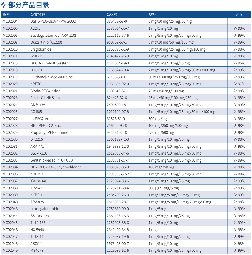 在患者體內(nèi),PROTAC 的靶蛋白配體和靶蛋白結(jié)合,E3 泛素連接酶配體和細(xì)胞內(nèi)的 E3 泛素連接酶的底物結(jié)合區(qū)結(jié)合,從而通過 Linker 把靶蛋白“拉近”到 E3 泛素連接酶旁邊,實(shí)現(xiàn) UPS 系統(tǒng)將靶蛋白降解。GenStar目前可提供多種 PROTAC 相關(guān)分子產(chǎn)品,包含:PROTACS、PROTACLinker、Ligands for E3 Ligase.Ligands for Target Protein for PROTAC、 Molecular Glues、ATTECs、E3 Ligase Ligand-LinkerConjugates 等。