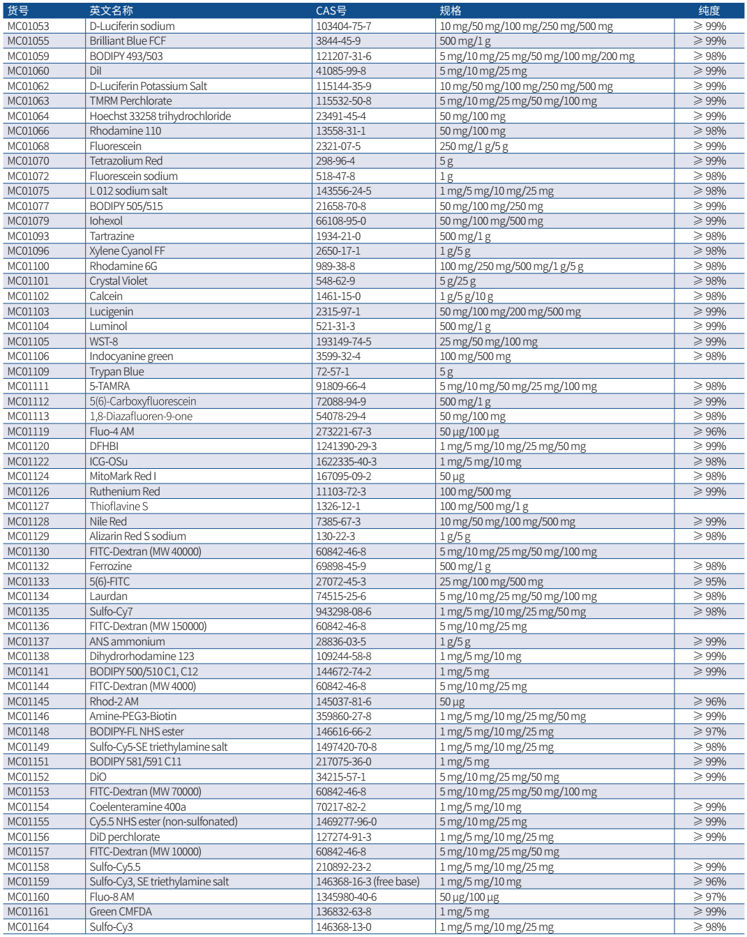 熒光染料是指吸收某一波長的光波后能發(fā)射出另一波長大于吸收光的光波的物質(zhì)。通過共價(jià)結(jié)合或物理吸附在所要研究物質(zhì)結(jié)構(gòu)中,借助熒光特性對被標(biāo)記對象進(jìn)行定性、定位以及定量分析。其在蛋白的功能研究、藥物篩選等領(lǐng)域具有廣泛的應(yīng)用。